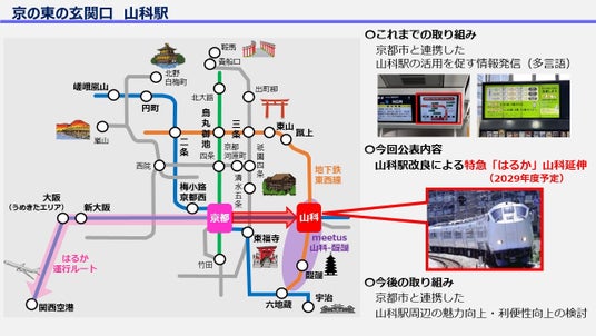 この度、山科駅を京の東の玄関口として利用いただくため、改良工事に着手することとしました。工事完成後は、京都駅発着としている特急「はるか」を山科駅まで延伸します。山科駅では地下鉄東西線等へ乗り換えいただくことで京都市内アクセスがより便利になります。