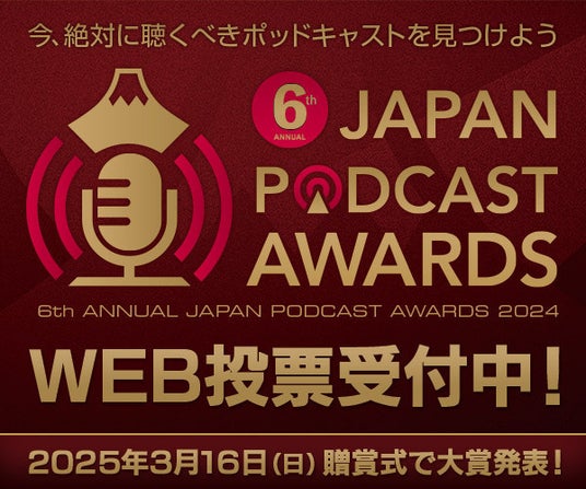 「第6回 JAPAN PODCAST AWARDS」は、2024年12月2日(月)より、一般投票による一次選考を開始いたしました。一次選考では、あらゆるポッドキャストコンテンツを対象に、「人に勧めたい」「他の人にも聴いて欲しい」という番組への一般投票を受け付け、得票数の多い20作品を選出します。