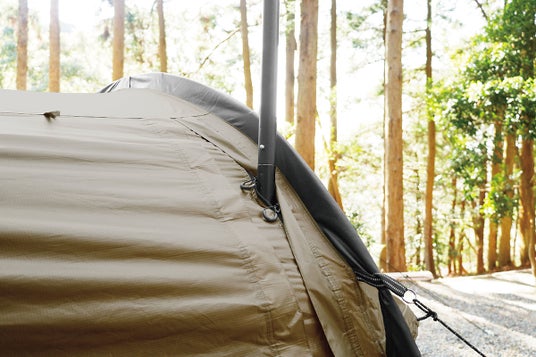フロント部分を跳ね上げればキャノピーとしても使用可能。キャノピーにはサイドウォールが付属しており、雨や風の侵入も防いでくれます。