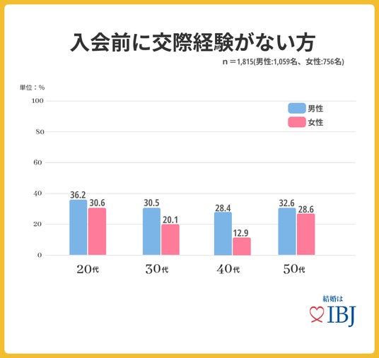 結婚相談所の入会前に、交際経験が「ない」と回答した20代は3割を占めました。他の年代と比較して割合が高い事から、若者世代の恋愛に対する価値観や、優先順位の変化等が現れているのかもしれません。また、コンプライアンス意識の高まりから職場での恋愛などが減少²することによって、自然に出会える機会が少ないことも影響している可能性があります。