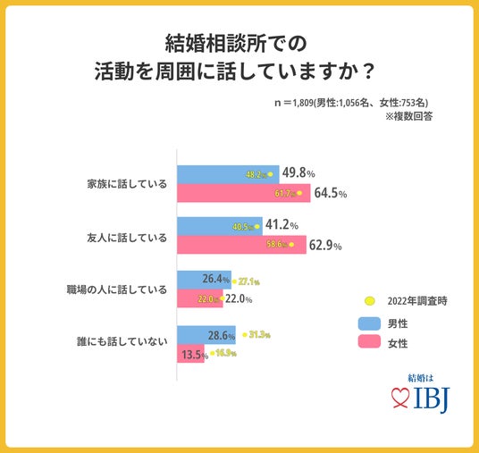 結婚相談所での活動を周囲に「話していない方」は、2022年度の調査⁴と比べて男性は2.7ポイント、女性は3.4ポイント減少しました。近年では社会の多様化や個人のライフスタイルの変化に伴い、相談所の利用は、一般的な選択肢として認識されるようになっています。