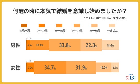 1.男性は「30~34歳」、女性は「25~29歳」の時に本気で結婚を意識し始める。