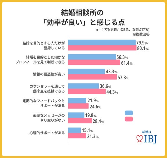 8割の男女は相談所の効率が良い点に「結婚を目的とする人だけが登録している」と回答。