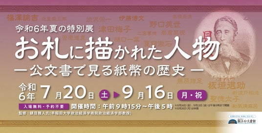 独立行政法人国立公文書館(所在地:東京都千代田区、館長:鎌田 薫)は、9月16日(月・祝)まで、令和6年夏の特別展「お札に描かれた人物-公文書で見る紙幣の歴史-」を開催中です。