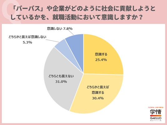 「パーパス」や企業がどのように社会に貢献しようとしているかを、就職活動において「意識する」と回答した学生が25.4%に上りました。「どちらかといえば意識する」30.4%を合わせると、「意識する」とした学生は6割に迫ります。