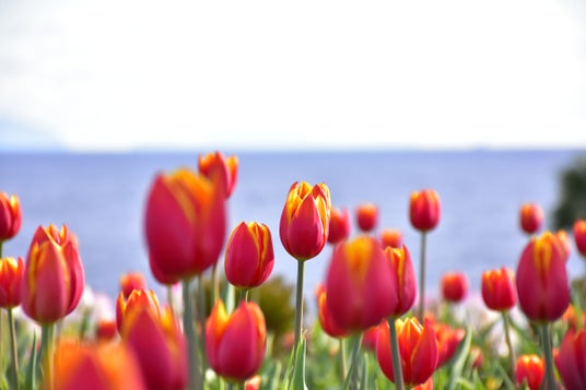 海を望む花畑でカラフルなアイスチューリップが咲く