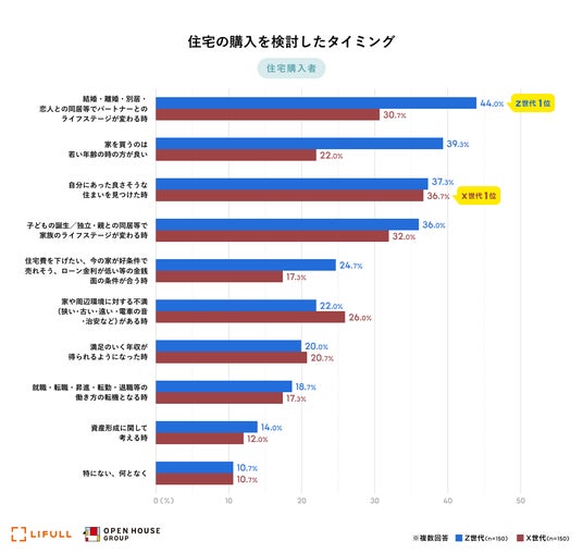 Z世代・X世代の住宅購入者それぞれに住宅の購入を考える・検討したタイミングについて聞いたところ、Z世代では「結婚・離婚・別居・恋人との同居等でパートナーとのライフステージが変わる時」が最多の44.0%、一方、X世代の最多回答は「自分にあった良さそうな住まいを見つけた時」で36.7%となりました。