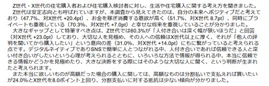 「住宅購入は早い方がいい」という価値観が顕在化した結果となり、調査結果を鑑みると今後、20代の住宅需要が増加する可能性がうかがえます。また、Z世代は大切な人との幸せな時間を最大化するライフプランの一つとして住宅も検討していることがわかりました。