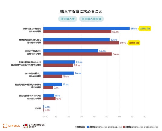 ・Z世代が家に求めるのは「家族との時間を”楽しめる”場所」が68.0%で1位。X世代を14.3pt上回る