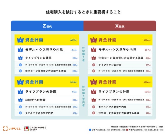 Z世代・X世代の住宅購入者および住宅購入意向者に対し、住宅購入を検討するときに重要視することを聞いたところ、いずれの世代でも住宅購入者・住宅購入意向者共通して「資金計画」という回答が最も多い結果となりました。次いで住宅購入者では「モデルハウス見学や内見」、住宅購入意向者では「ライフプランの計画」に両世代共通して多くの票が集まりました。