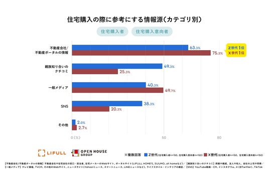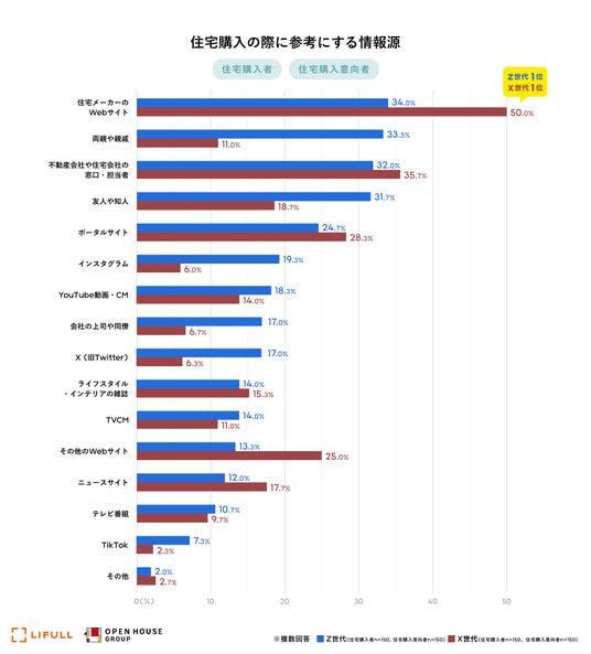 Z世代・X世代の住宅購入者および住宅購入検討者に対し、住宅購入を検討するうえで参考にしている情報源を聞いたところ、Z世代では34.0%、X世代では50.0%といずれの世代でも「住宅メーカーのWEBサイト」が最多となりました。