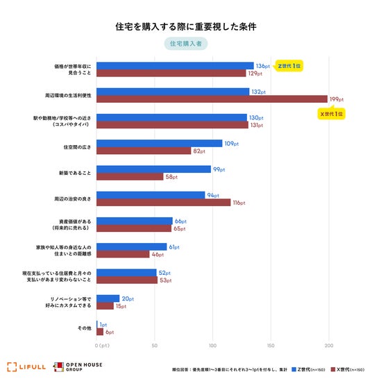 Z世代・X世代の住宅購入者に対し、購入の条件について重要視する項目を聞いたところ、Z世代では「価格が世帯年収に見合うこと」(15.1%)という回答が最も多く、次いで「周辺環境の利便性」(14.7%)、「駅や勤務地/学校等への近さ(コスパやタイパ)」(14.4%)が上位の回答となりました。