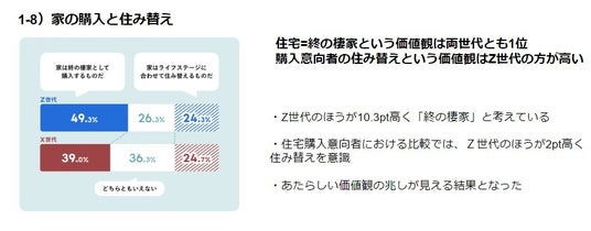 ・Z世代のほうが新築へのこだわりが強く(4.6pt差)、購入後も住み替えるという価値観が2pt高かった