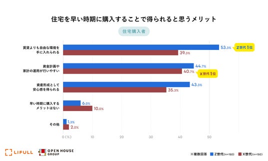 Z世代・X世代の住宅購入者に対し、住宅を早い時期に購入することで得られると思うメリットについて聞いたところ、Z世代では「賃貸よりも自由な環境を手に入れられる」と回答した人が53.3%で最多となりました。「早い時期に購入するメリットはない」と回答した割合がX世代では10.0%だったのに対し、Z世代では6.0%と、Z世代の方が比較的住宅の早期購入にメリットを感じている人が多いことがうかがえる結果となりました。