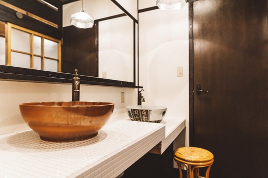 段差をつけ、洗面ボウルを2台設置した洗面所