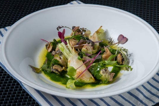 メニュー名:本ズワイ蟹と菜の花、福島県産あおさのソース