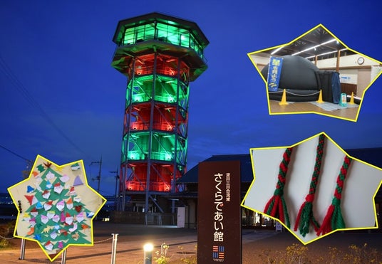 期間中は、さくらであい館展望塔を赤と緑のクリスマスカラーで彩る『クリスマスライトアップ』をご覧いただけるほか、さくらであい館内に折り紙ツリーを設置し開館時間内は自由に折り紙を折って飾っていただけます。