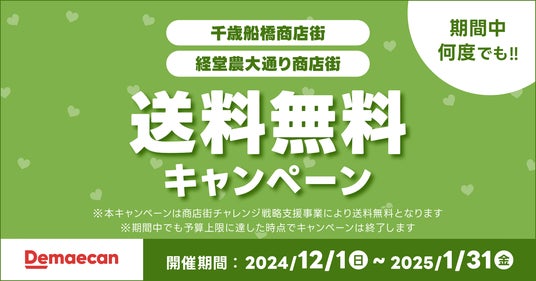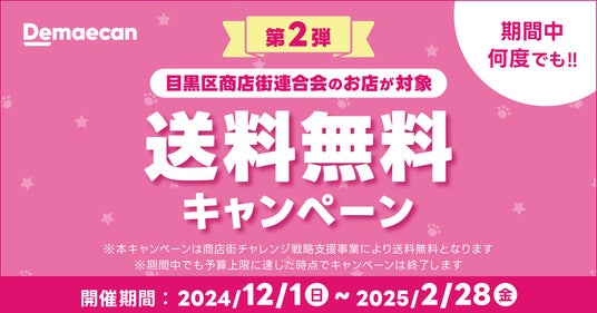 株式会社出前館は、運営する日本最大級のデリバリーサービス「出前館」において、目⿊区商店街連合会とデリバリーの利用促進を目的としたキャンペーンを2024年12月1日(日)より実施いたします。なお、昨年に引き続き2回目の実施です。また同時に、東京都世田谷区の千歳船橋商店街、経堂農大通り商店街と連携した送料無料キャンペーンも初めて実施いたします。
