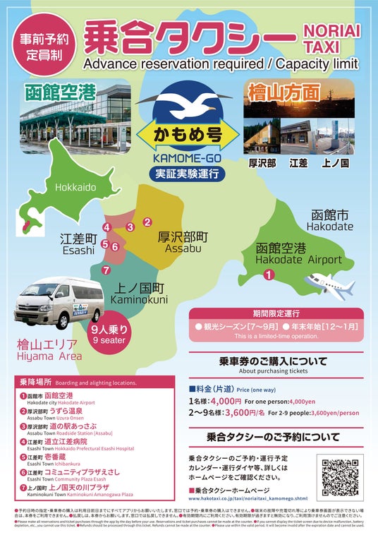 函館タクシー株式会社が、檜山3町(江差町、上ノ国町、厚沢部町)、北海道エアポート株式会社 及び北海道檜山振興局と連携し、ジャンボタクシーによる乗合タクシーの実証運行を行います。
