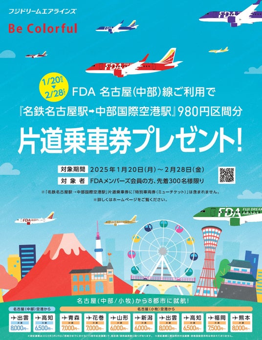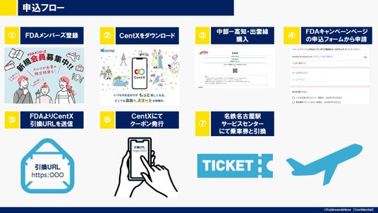 同キャンペーンでは、FDAメンバーズ会員に登録済みで、中部国際空港-高知線または出雲線をご利用の方、さらに名古屋鉄道が提供するエリア版MaaSアプリ「CentX」をダウンロードしているお客さまの中から先着300名様に、「名鉄名古屋駅→中部国際空港駅の大人普通片道乗車券」をプレゼントします。