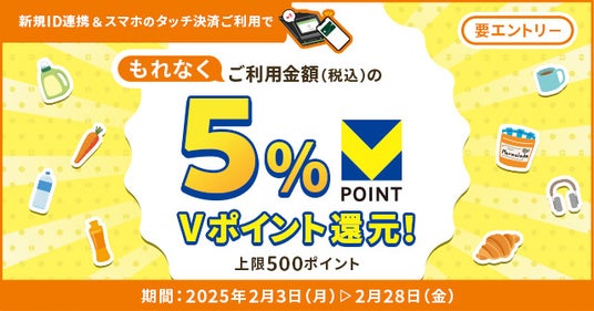 初めてのID連携&スマホのタッチ決済ご利用で、もれなくご利用金額(税込)の5%相当のVポイントをプレゼント!