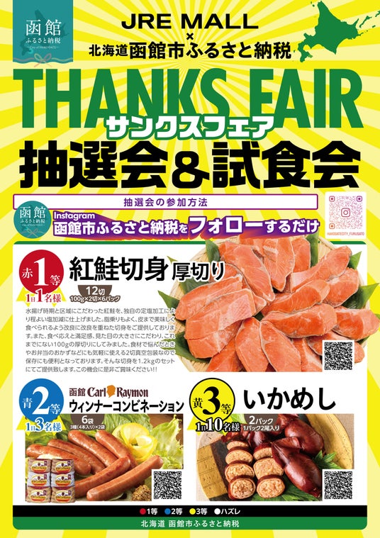 函館市は、2024年9月6日(金)、7日(土)、8日(日)の3日間にわたり、ふるさと納税イベント「北海道函館市ふるさと納税サンクスフェア」をJR横浜駅中央北改札内にある「JRE MALL Cafe」にて開催します。