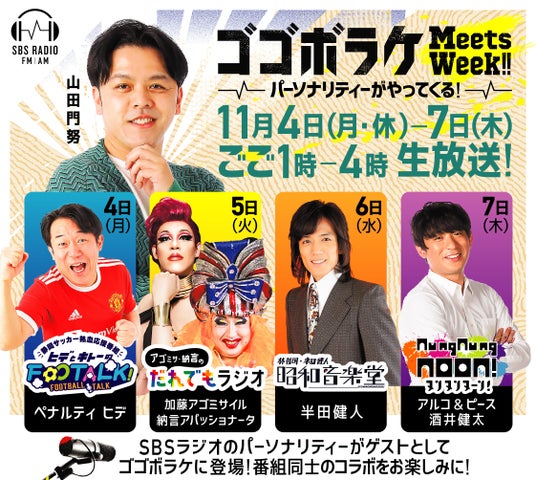 SBSラジオの平日午後ワイド『ゴゴボラケ』(毎週月‐木曜、午後1時‐4時生放送)が11月4日(月・祝)~7日(木)の4日間、同じSBSラジオで番組パーソナリティーを務める人物をゲストに招き、トークを展開する特別企画『Meets Week!!-パーソナリティがやってくる‐』を実施します!
