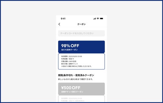 2.専用アプリから定期チケットの購入時、もしくはクーポン画面からコードを入力し、クーポンを取得します。