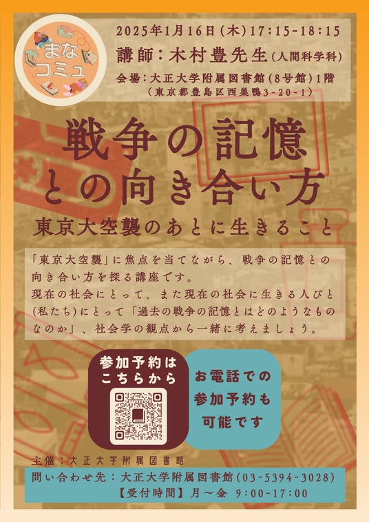 大正大学(学長:神達知純、所在地:東京都豊島区)の附属図書館では、2025年1月16日(木)に、「戦争の記憶との向き合い方 東京大空襲のあとに生きること」と題し、現代の社会や人々にとって“過去の戦争の記憶とはどのようなものなのか”を社会学の観点から考える講座を開催します。