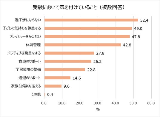 受験において気を付けていること1位は、過半数が回答した「過干渉にならない(52.4%)」でした。次いで「子どもの気持ちを尊重する(49.0%)」「プレッシャーをかけない(47.8%)」という回答が多く、精神面や、子どもとの距離の取り方に気を遣っている親が特に多いことがわかります。