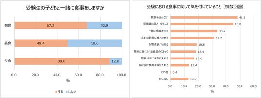 受験を控えた子どもとのコミュニケーションや、自身のサポートに不安を感じている親がいることがわかりました。親子のコミュニケーションのきっかけにもなるのが、食事の場。親子で一緒に食事をとっているか聞いたところ、夕食は約9割の親子が一緒にとっていました。朝食も約7割の親子が一緒にとっており、コミュニケーションへの悩みは抱えながらも、可能な限り子どもと一緒に食事をしようとしている親が多いようです。食事に関して気を付けていることを聞いたところ、「朝食を抜かない(48.2%)」「栄養価の高さ・バランス(45.0%)」といった意見がありました。