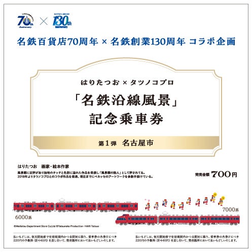 名古屋鉄道は、創業130周年と名鉄百貨店の開店70周年を記念したコラボ企画として、名鉄百貨店開店70周年記念「タツノコアートフェス」開催にあわせ、はりたつお×タツノコプロ「名鉄沿線風景」記念乗車券を発売します。