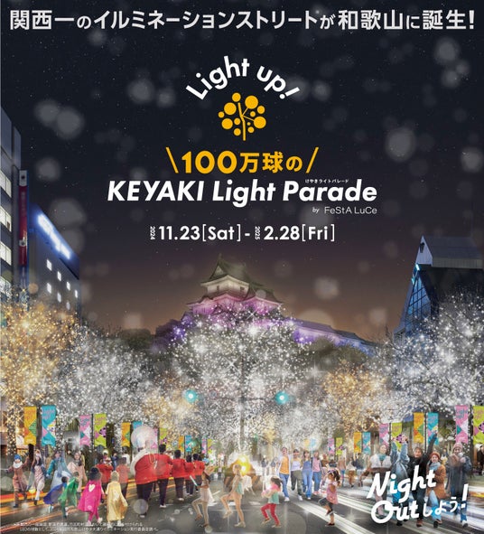 夜の和歌山城公園を光で彩る和歌山城~光の回廊~が11月24日(日)からスタートし、同日17時30分から点灯式を開催。11月23日から始まるKEYAKI LIGHT PARADEと光の演出で連動したウォーカブルに楽しめる夜の和歌山城公園をお楽しみください。