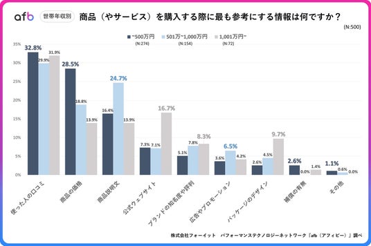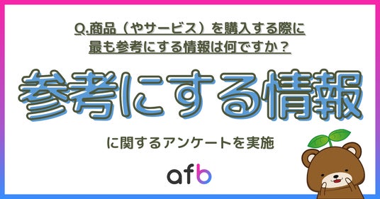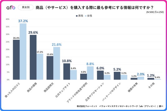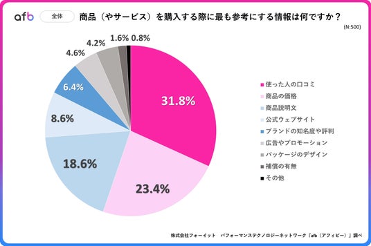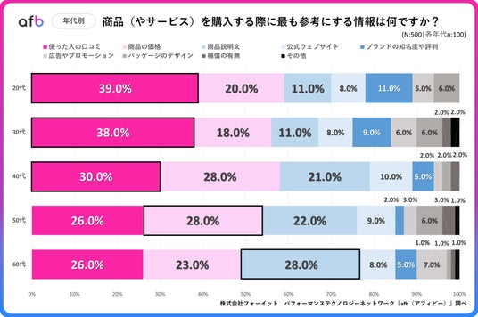 パフォーマンステクノロジーネットワーク「afb(アフィビー)」< https://www.afi-b.com/ >の開発運用をおこなう株式会社フォーイットは、全国の20歳~60歳までの男女500人を対象に商品購入時に参考にする情報に関するアンケートを実施し、年代別等の特徴についてまとめました。