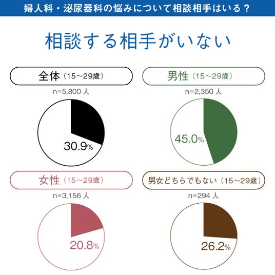 ジョイセフI LADY.が2023年に15~29歳の5,800名を対象に実施した「性と恋愛」意識調査では、性の相談全般について相談する相手がいないと回答した男性(n=2,350)が約3割にのぼりました。さらに「婦人科・泌尿器科の悩み」に限定すると、相談する相手がいない割合は45%となりました。