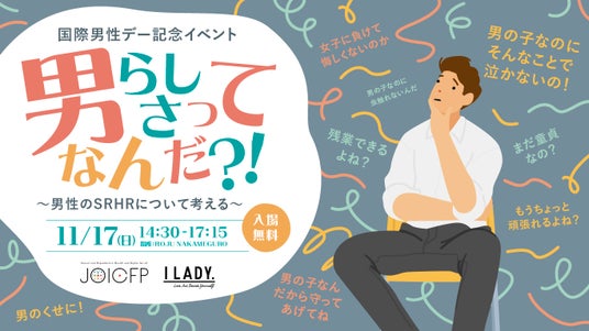 国際協力NGOジョイセフ(東京都新宿区)は、特に日本の若者を対象にSRHR(セクシュアル・リプロダクティブ・ヘルス/ライツ:性と生殖に関する健康と権利)を啓発するI LADY.プロジェクトの一環で、11月17日にみんなで「男らしさ」について考えるイベント、「男らしさってなんだ?!~男性のSRHRについて考える~」を開催します。