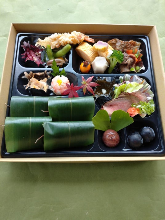 ・内容:天橋立の成り立ちの神話が由来の笹寿司をはじめ、鯛や白バイ貝など丹後の名産をふんだんに使用したお弁当。若狭名物「でっち羊かん」とお茶がセット