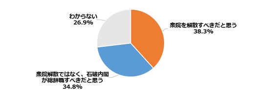 2025年度当初予算案や重要法案が否決されたり、内閣不信任決議案が可決されたりした場合に、石破首相が衆院を解散すべきだと思う人が38.3%、石破内閣が総辞職すべきだと思う人が34.8%、わからないとした人が26.9%だった。