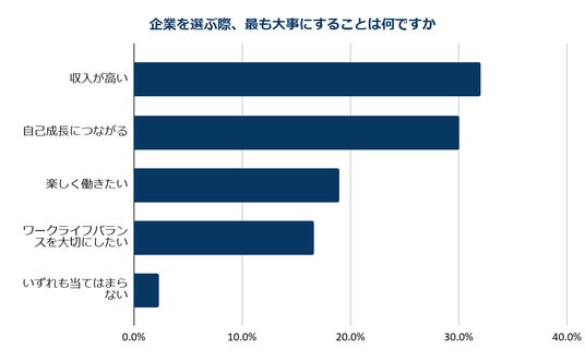 企業を選ぶ際に最も大事にすることを聞いたところ、「収入が高い」ことが最も多く回答を集めました。これに「自己成長につながる」や「楽しく働きたい」が続いており、ワークライフバランスを抑えました。高い報酬を得られることや自己成長を重視する優秀層学生の価値観がうかがえます。