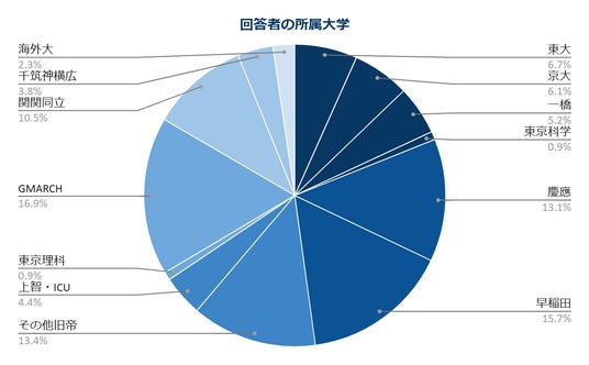 回答者の約50%は東京大学・京都大学・早稲田大学・慶應大学・一橋大学・東京科学大学のいわゆる上位校学生が占め、旧帝大全体やGMARCHも含めると80%超となります。