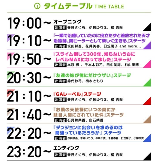 総合MCにはGAレーベル公式YouTubeチャンネル「GA文庫チャンネル」で配信中の『春日さくら・伊駒ゆりえ・橘 杏咲のパジャマナイト』でお馴染みの春日さくらさん、伊駒ゆりえさん、橘 杏咲さんを迎え、下記のタイムスケジュールで開催します。人気タイトルの最新情報が一気にチェックできるこの機会を、どうぞお楽しみに。