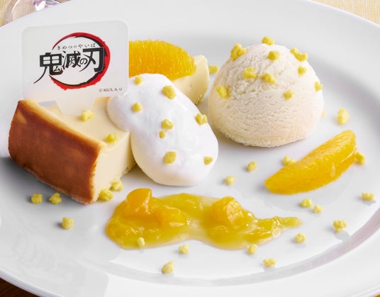 雷に打たれて金髪になった善逸をイメージし、黄色いマンゴーソースをあしらったチーズケーキプレート。小さなチョコキャンディの粒が必殺技「雷の呼吸 霹靂一閃」の稲妻のように口の中でパチパチ弾けます。