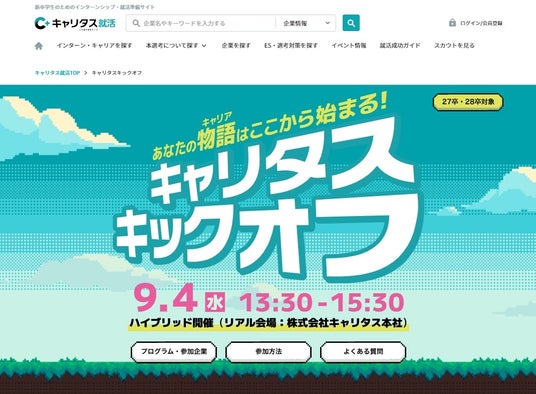 株式会社キャリタス(本社:東京都文京区、代表取締役社長:新留正朗)は、大学1、2年生を対象に、卒業後のキャリアや将来について考えるきっかけを与えるイベント「キャリタス キックオフ」(参加無料/リアル・オンライン同時開催)を9月4日(水)に開催いたします。