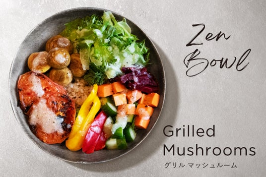 新鮮な野菜と塩麹ドレッシングで味付けされたグリルマッシュルームとトマトが主役のサラダボウルです。木桶仕込みの醤油がほんのり香る発酵炊き込みご飯との相性も抜群です。
