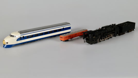 左から「新幹線 電車(動力車) 12号車 22形式」、「国電 クハ103型」、「汽車 機関車(炭水車付き) C62型」