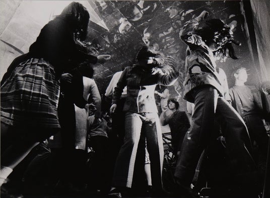 ゴーゴーはロックのリズムに合わせて身体を激しく揺り動かす野性的な踊りで、男女問わずティーンエイジャーの間で大流行となりました。チェック柄のセットアップやサイケ調のシャツを着こなし、熱狂的に踊る人々を捉えたこの写真は、60年代後半の若者文化が凝縮された1枚です。