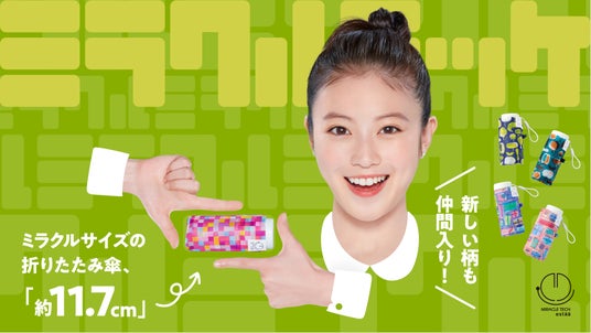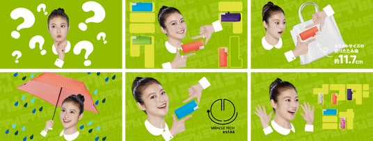 煙の中からボワンと今田さんが登場、指を向かいあわせにしたハンドサインの中に「ミラクルテック」が登場します。今田さんの「ミラクル?」という一言とともに、ミニバッグの中にもすっぽりと収まるサイズの傘に、驚く表情を見せます。リズムに乗せて、OKサイン、グッドサインなどテンポよく今田さんの表情が切り替わっていき、最後に「わたしの中にも?ミラクルミッケ!」の一言で元気よく締めくくります。