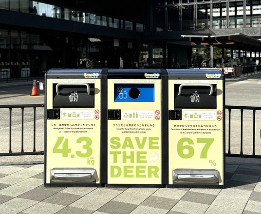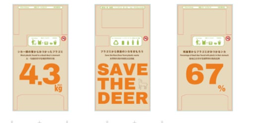 奈良公園では、食べ物の匂いが付着したプラスチックゴミをシカが誤食する問題があり、死亡したシカの胃からプラスチックゴミが見つかるケースが67%、一頭の胃から見つかったプラスチックゴミは最大値で4.3kgにものぼっています。そうした背景のもと、今回奈良県はゴミ箱正面に、「シカを、ポイ捨てゴミによる誤食から守ろう」というメッセージを配したデザインを採用しました。こうしたメッセージを通じて、人々の行動変容を促し、シカのゴミの誤食が減少する効果が期待されます。