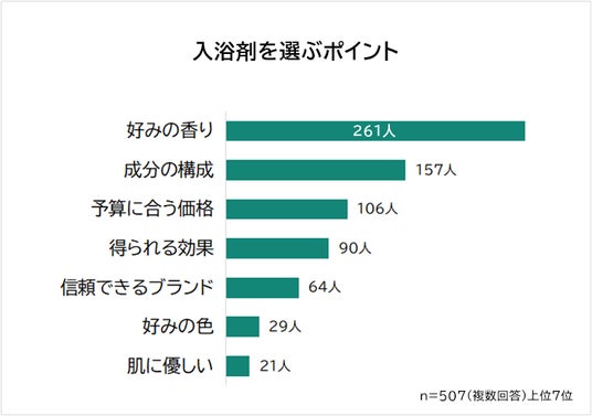 「入浴剤を選ぶポイントは何か?」と質問したところ、もっとも多かった回答は「好みの香り(261人)」でした。2位「成分の構成(157人)」、3位「予算に合う価格(106人)」、3位「得られる効果(90人)」が続きます。