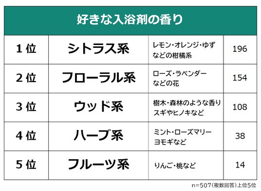 入浴剤を使っている507人に「好きな入浴剤の香り」を聞いたところ、1位は「シトラス系(196人)」で全体の4割近くを占めました。
